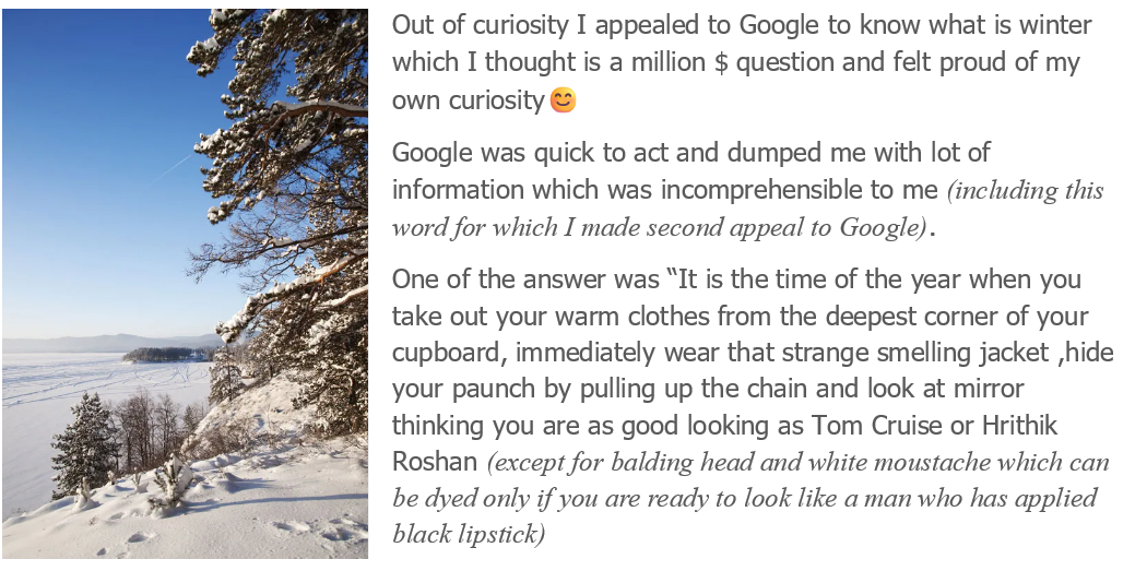 Well, where do we start with this title? As children, we have heard stories of kings, demons, flying devils, brave hearts, etc. But the story of winter !!! Neither heard such a story nor ever heard about such a story. So I thought let me write something about winter and it may become as story in future.